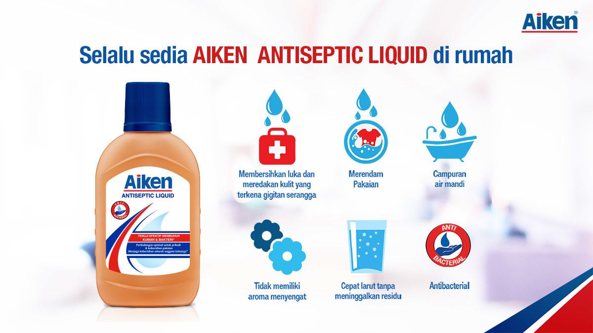 Dengan pola hidup bersih dan sehat, maka Anda dapat mengurangi risiko terpapar kuman dan terhindar dari masalah kesehatan. Gunakan Aiken Antiseptic Liquid untuk keluarga yang sehat dan bebas kuman penyakit!