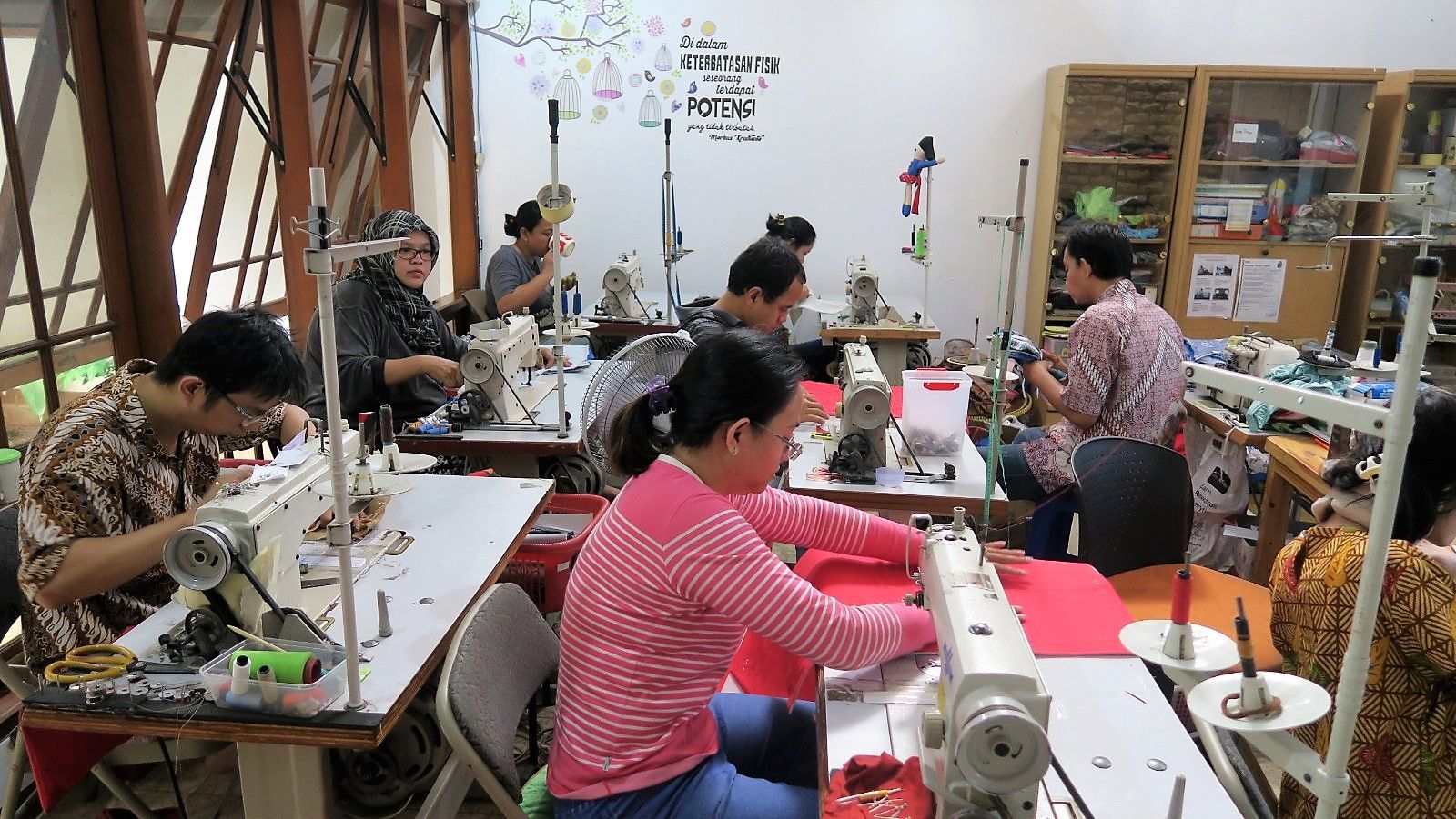 “Itu kutipan darinya,” Ratna menoleh ke belakang, menunjuk ke sebuah dinding yang berhiaskan ornamen tulisan: ‘Kelumpuhan yang sebenarnya bukan ada pada kaki, tapi pada pola pikir & hati’.