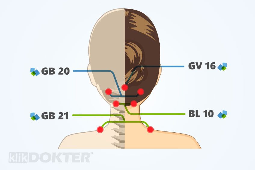 Terdapat 4 titik di area leher yang berhubungan dengan sakit kepala. Titik utama, yaitu GV 16 atau yang disebut Feng Fu. Titik ini terletak di belakang kepala, di antara kedua telinga dan persis di ujung atas tulang belakang.